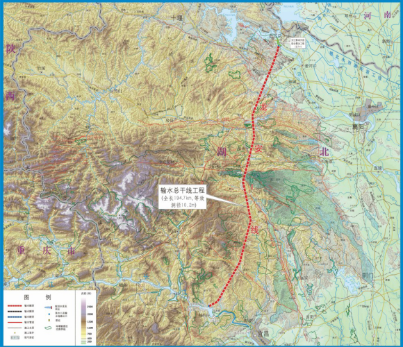 引江補(bǔ)漢工程作為南水北調(diào)中線后續(xù)水源工程,從長江三峽庫區(qū)引水入漢江,沿線由南向北依次穿越宜昌市夷陵區(qū)、襄陽市??悼h、谷城縣和十堰市丹江口市。主要包括輸水總干線工程和漢江影響河段綜合整治工程,為有壓單洞自流輸水,多年平均調(diào)水量為39億立方米,引水流量隨三峽水庫水位變化為170~212立方米每秒。工程施工總工期108個(gè)月,工程靜態(tài)總投資551.58億元。