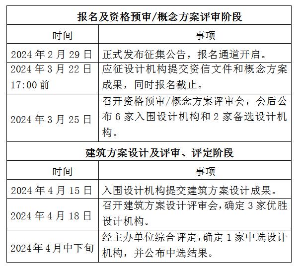 本次征集采用公開報名的方式,征集分“報名及資格預(yù)審/概念方案評審”、“建筑方案設(shè)計及評審、評定”兩個階段: