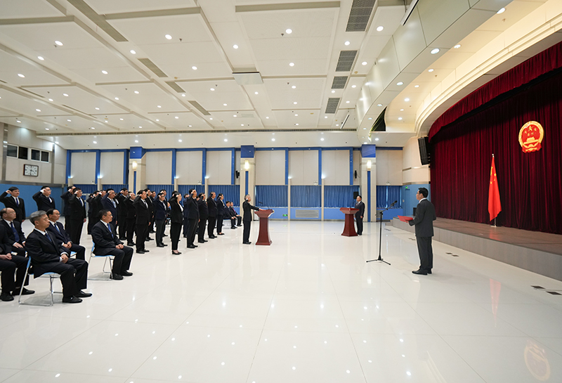 李國英監(jiān)誓后講話。他強調,全體新任職同志要以此次憲法宣誓為新起點,更加緊密地團結在以習近平同志為核心的黨中央周圍,堅持不懈用習近平新時代中國特色社會主義思想凝心鑄魂,深入學習貫徹習近平總書記“節(jié)水優(yōu)先、空間均衡、系統(tǒng)治理、兩手發(fā)力”治水思路和關于治水的重要論述精神,堅定擁護“兩個確立”、堅決做到“兩個維護”,不斷提高政治判斷力、政治領悟力、政治執(zhí)行力,當好貫徹黨中央決策部署的執(zhí)行者、行動派、實干家,確保水利工作始終沿著習近平總書記指引的方向前進。要學深悟透習近平法治思想,堅持以憲法為根本活動準則,維護憲法權威,恪守法治精神,帶頭尊法學法守法用法,堅持依法行政,全面履行法定職責,不斷提高運用法治思維和法治方式推動工作、解決問題的能力和水平。要牢固樹立和踐行正確的權力觀、政績觀、事業(yè)觀,把“時時放心不下”的責任感轉化為“事事心中有底”的行動力,錨定目標、奮勇進取,增強推動水利高質量發(fā)展、服務群眾、防范化解風險的本領。要深化黨紀學習教育,學紀、知紀、明紀、守紀,筑牢思想防線、守住廉潔底線、守牢法紀紅線,做到心有所畏、言有所戒、行有所止,堅持公正用權、依法用權、為民用權、廉潔用權,在任何時候任何情況下都不放縱、不越軌、不逾矩,永葆清正廉潔政治本色。