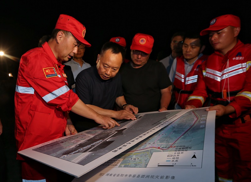李國(guó)英現(xiàn)場(chǎng)勘察團(tuán)洲垸堤防決口情況,研究決口封堵方案