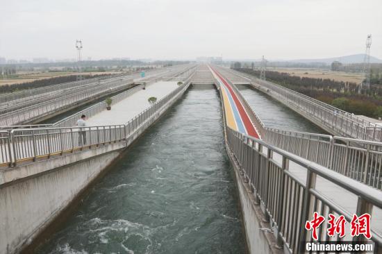 據(jù)悉,沙河渡槽工程根據(jù)結(jié)構(gòu)形式從上游向下游依次為,全長2838.1米的明渠段、全長1666m的沙河梁式渡槽段、全長3534米的沙河-大朗河箱基渡槽段、全長500米的大朗河梁式渡槽段、全長1820米的大朗河-魯山坡箱基渡槽段、全長1530米的魯山坡落地槽段以及50m長明渠渠道。圖為一泓“南水”北流途經(jīng)渡槽。